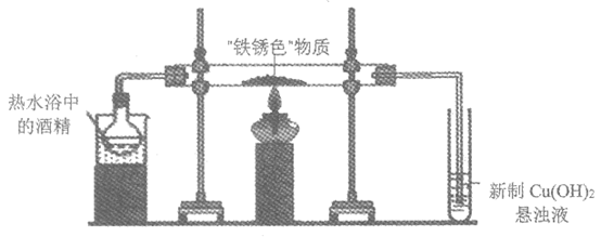 实验ii:先用酒精蒸气排尽装置中的空气,再在“铁锈色“物质处加热,充分反应至“铁锈色“物质完全变成“黑色“物质。取下装有新制Cu(OH)2的试管,加热,有砖红色沉淀生成。