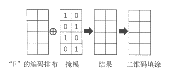 将每个字母的编码按照一定的顺序排布在方格内,例如字母”S”的编码排布如下图第一个表格,然后将编码排布与事先排布好0与1的表格(称为掩模)进行”方格一一对应”的”异或”运算(如下图第三个表格),并将结果中1的位置填涂黑色,0的位置填涂白色(如下图第四个表格)。