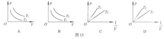 (3)在不同温度环境下,另一位同学重复了上述实验,实验操作和数据处理均正确。环境温度分别为T1、T2,且T1>T2。在如图13所示的四幅图中,可能正确反映相关物理量之间关系的是___________(选填选项的字母)。